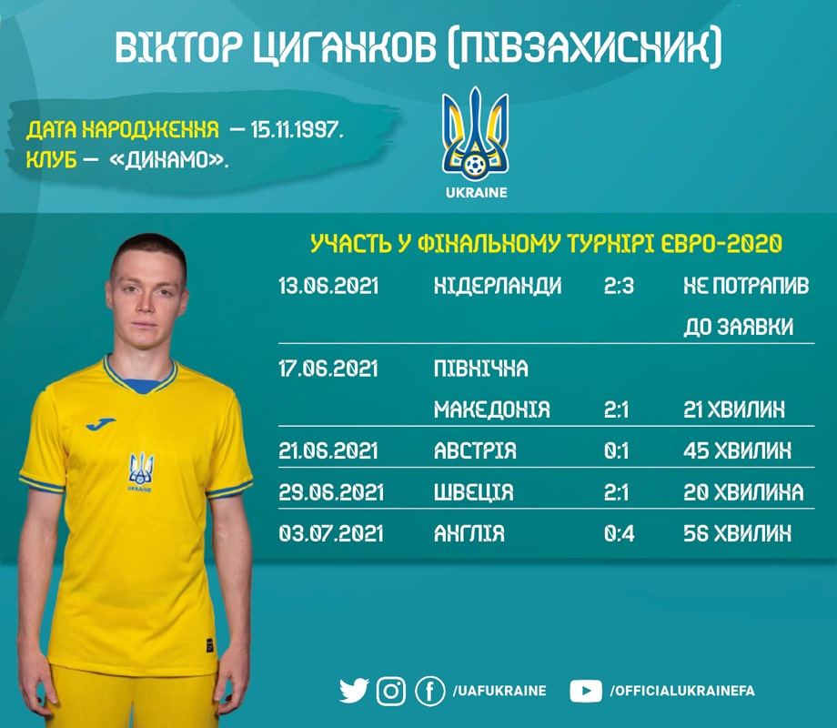 На Євро-2020 Віктор Циганков провів чотири матчі (142 ігрові хвилини). Загалом у складі збірної України футболіст київського «Динамо» зіграв 30 поєдинків (1 383 хвилини), в яких забив шість м’ячів.