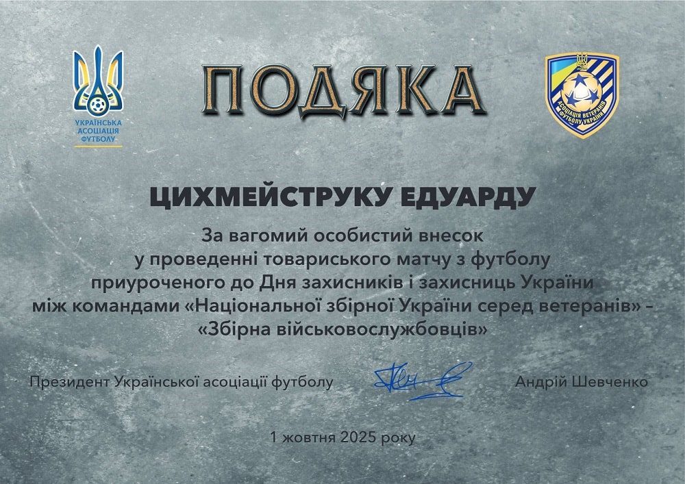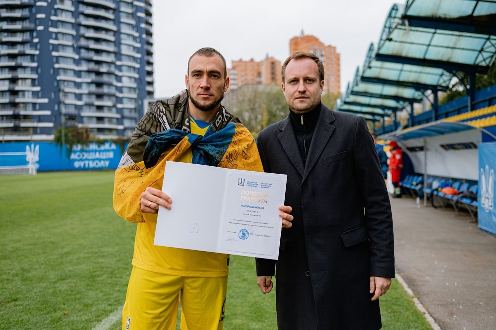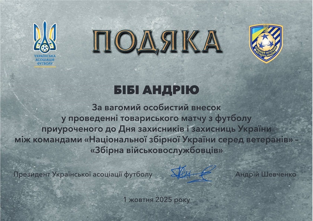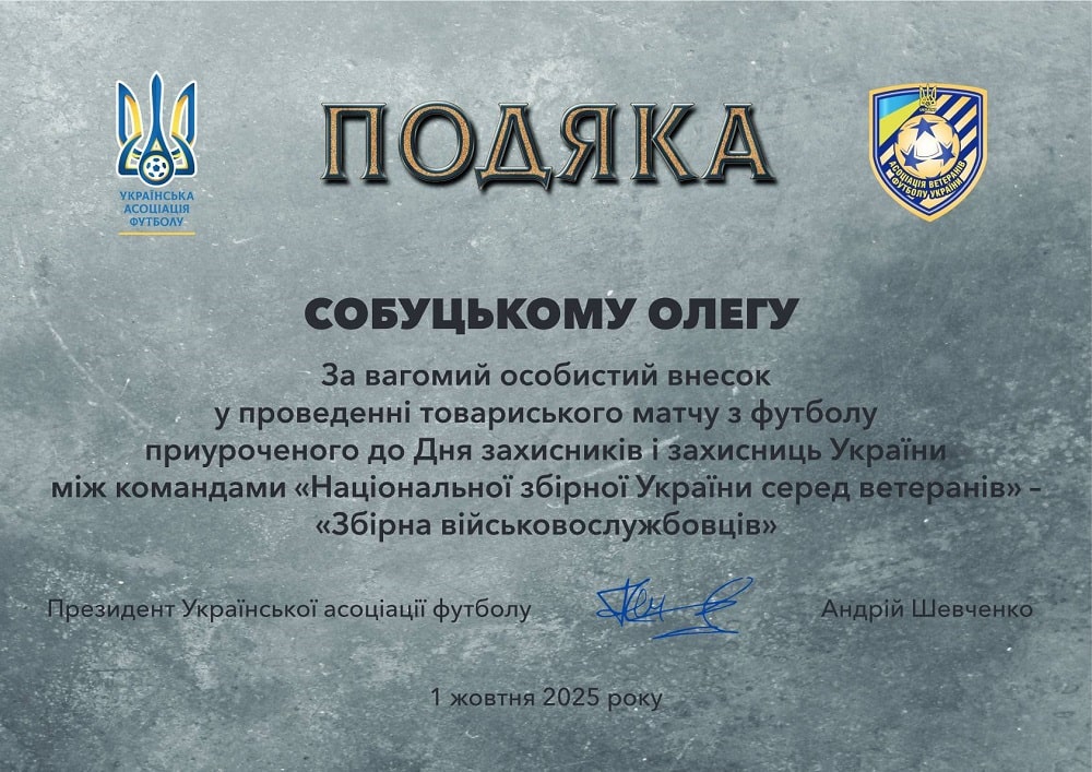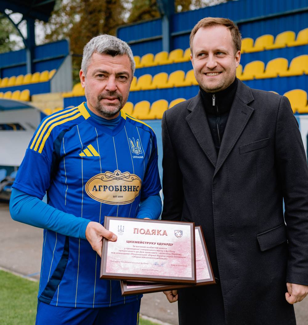 Під час урочистостей подяками Української асоціації футболу було нагороджено офіцера Збройних сил України, президента Асоціації ветеранів футболу України Олега Собуцького, першого віцепрезидента Асоціації ветеранів футболу України Андрія Бібу та головного тренера національної збірної України серед ветеранів Едуарда Цихмейструка.