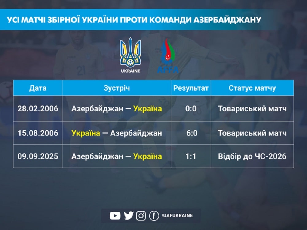Третє побачення команд відбулося трохи більше місяця тому: 9 вересня в Баку на Республіканському стадіоні імені Тофіка Бахрамова в межах відбору ЧС-2026 суперники розписали прикру для нас нічию — 1:1 із голом Георгія Судакова.
