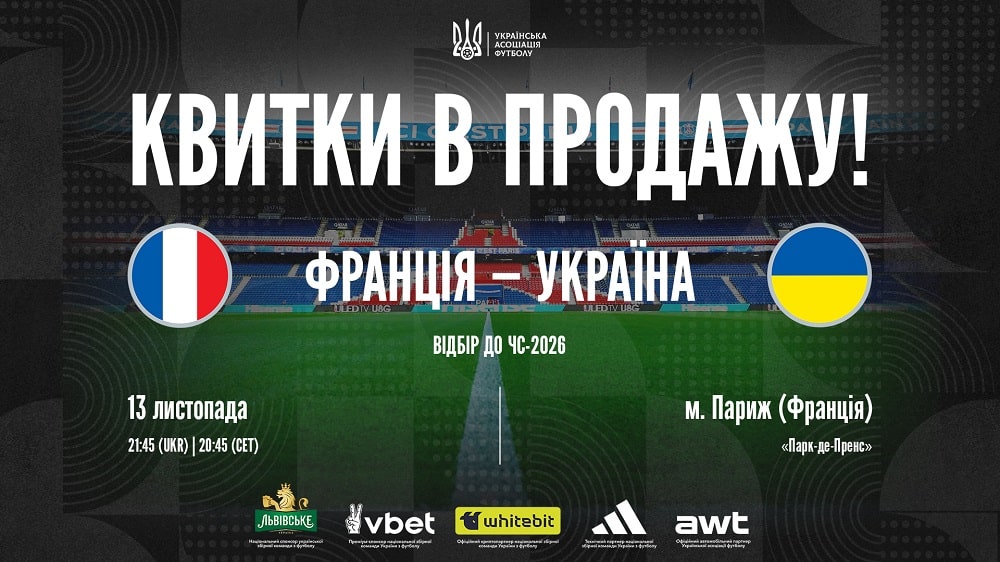 Шановні вболівальники! Розпочався продаж квитків на матч відбору ЧС-2026 Франція — Україна, який відбудеться 13 листопада в Парижі на стадіоні «Парк де Пренс» (початок — о 20:45 за місцевим часом).