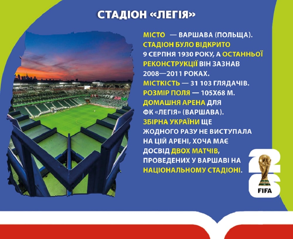 Сьогоднішній матч відбору ЧС-2026 Україна — Ісландія, який відбудеться у Варшаві на стадіоні «Легія» (початок гри — о 19:00 за Києвом), стане першим поєдинком синьо-жовтих на цій арені.