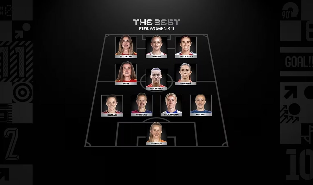 Ханна Гемптон (Англія, «Челсі») — Люсі Бронз (Англія, «Челсі»), Лія Вільямсон (Англія, «Арсенал»), Ірене Паредес (Іспанія, «Барселона»), Она Батльє (Іспанія, «Барселона») — Айтана Бонматі (Іспанія, «Барселона»), Патріція Гіхарро (Іспанія, «Барселона»), Клаудія Піна (Іспанія, «Барселона») — Алексія Путельяс (Іспанія, «Барселона»), Алессія Руссо (Англія, «Арсенал»), Маріона Кальдентей (Іспанія, «Арсенал»).