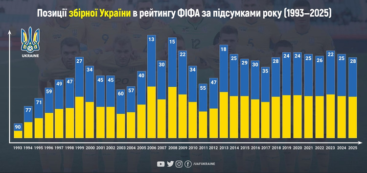 2025 рік збірна України завершила на 28-й позиції в рейтингу ФІФА. Учотирнадцяте поспіль наша національна команда розпочала новий рік у топ-50 підсумкового реєстру й ув...
